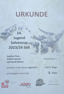 Die Niederndorferin Valerie Asprian konnte sich nach 3 Heimwettkämpfen und der heutigen Vorrunde des Salvencups fürs Finale qualifizieren und in der Altersklasse Jugend K3 den 4. Rang erreichen.